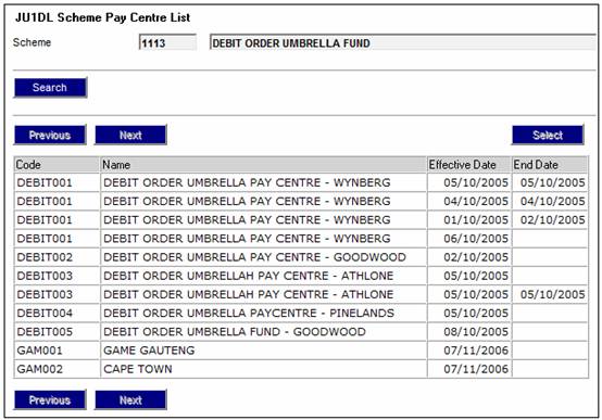 The JU1DL Scheme Pay Centre List screen will be displayed.
