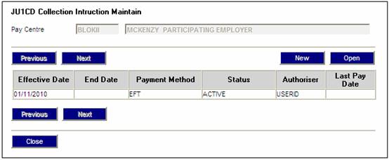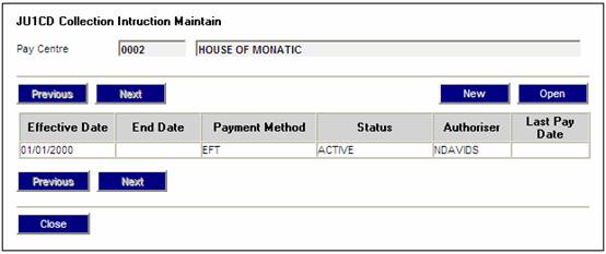 To view or amend an existing collection instruction, from the JU1CD Collection Instruction Maintain screen, highlight the required instruction and select Open Collection Instruction from the sub-menu on the left.