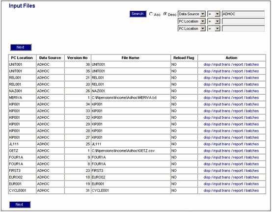 Displays the Input Files screen. Refer to Processes Contributions Income Income Input Files |