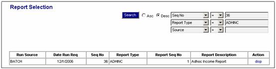 To generate and display an ad-hoc income report, from the above screen, click disp in the Action column alongside the required line. The Adhoc Income Report screen will be displayed in PDF format.